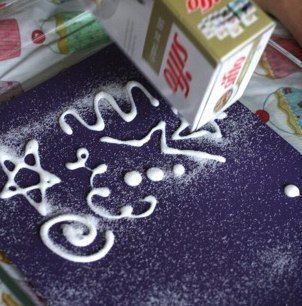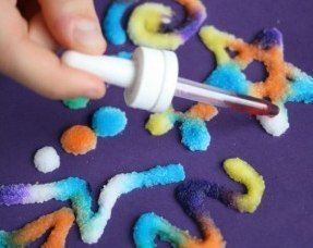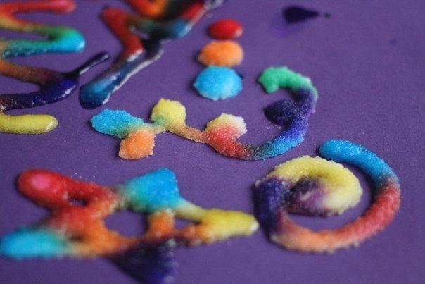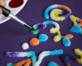Клеем прямо из бутылочки нарисуйте на картоне рисунок. Посыпьте его солью. Остатки соли стряхните над раковиной. Теперь приступаем к раскрашиванию нашего рисунка. Можно дождаться высыхания клея, а можно рисовать и по мокрому. Обильно смачивая кисточку в воде и краске рисуйте ей на соляных узорах. Цвет наносим "точечно", соль сама впитывает цветную воду. Вместо кисточки уместно использовать пипетку.