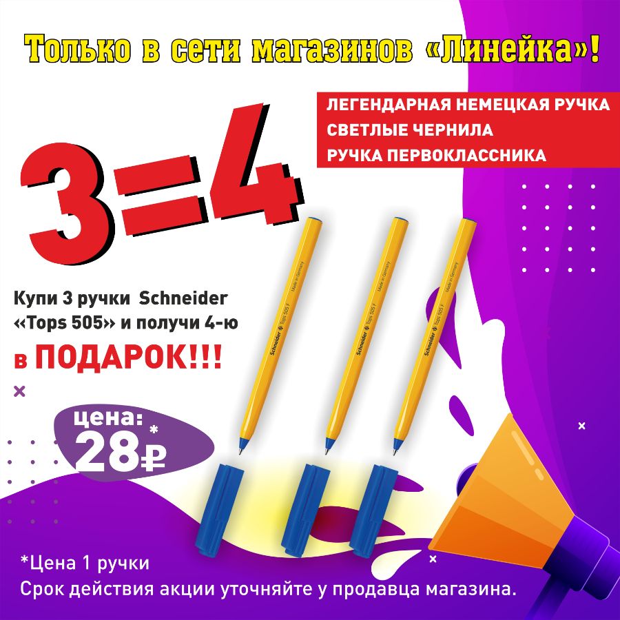 Во всех "Линейках" началась АКЦИЯ: приобретая 3 ручки Schneider "Tops 505 ", 4-ю ручку Вы получаете В ПОДАРОК!